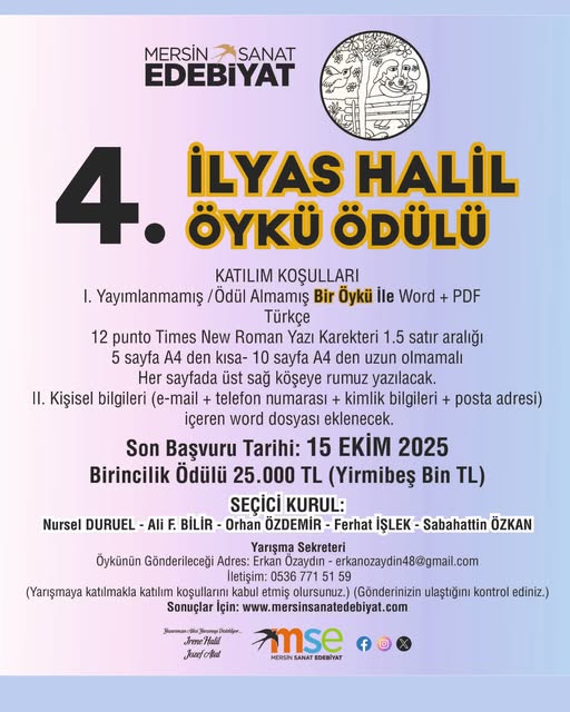 MERSİN SANAT EDEBİYAT DERNEĞİ İLYAS HALİL ÖYKÜ ÖDÜLÜ SONUÇLARI-2025 BİRİNCİLİK
